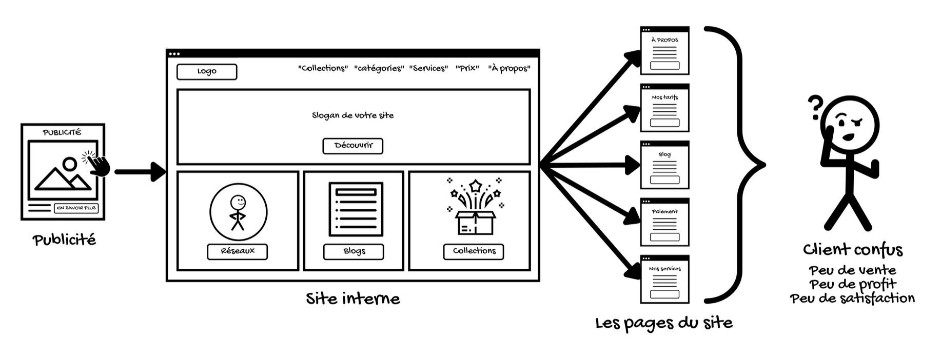 Cela créera une confusion chez votre client qui se traduira par une faible quantité de vente, donc peu de profit et une frustration de devoir naviguer sur des dizaines pages pour trouver l’information qu’il cherche.