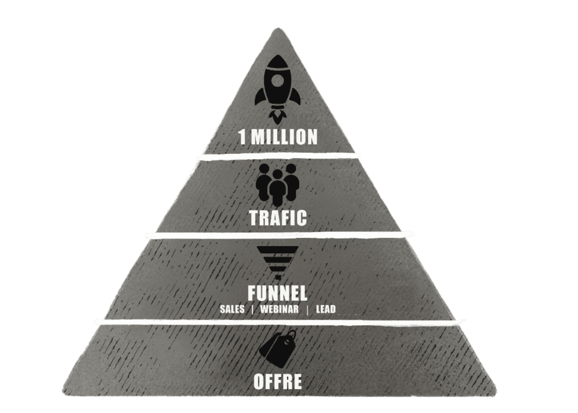 C’est pourquoi au fur et à mesure de votre progression dans le livre, vous allez passer par les différentes étapes de la pyramide ci-dessous jusqu’à avoir toutes les clés d’un business à un million (et au-delà).
