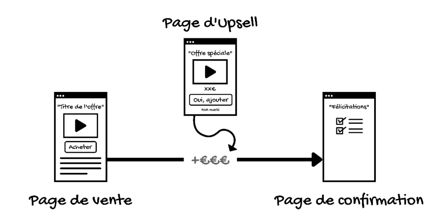 Selon lui, si une personne vient d’acheter notre offre, elle peut être intéressée d’en acheter une seconde si elle est complémentaire. Que ce soit pour aller plus vite ou plus loin. Et, qu’en leur proposant une offre immédiatement après leur premier achat, entre la page de vente et la page de confirmation, on pouvait multiplier par deux (ou plus) la valeur de ce nouveau client pour notre business. Il a appelé cette offre complémentaire, un “UPSELL“.