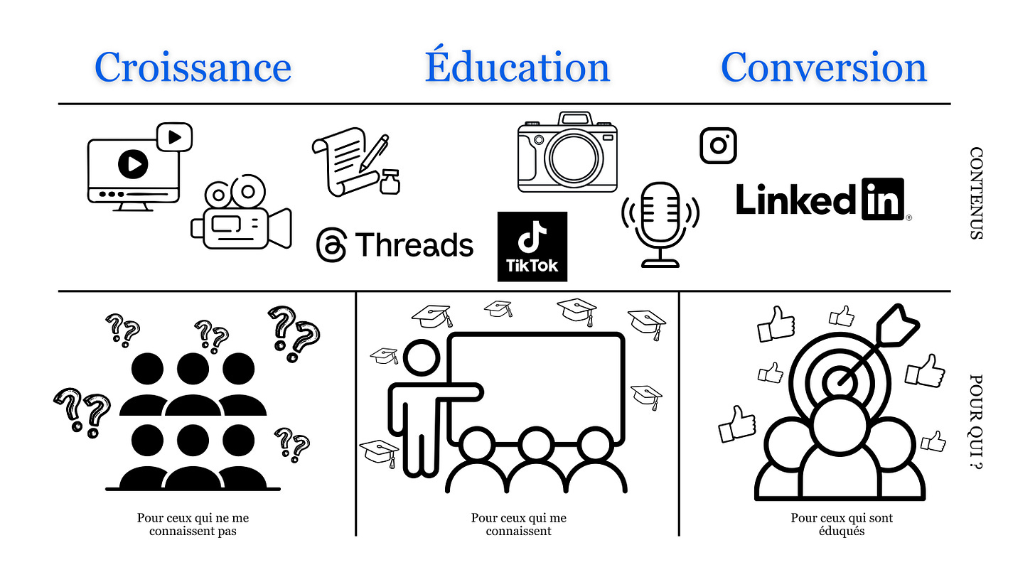 Le premier, c’est le contenu de croissance : il s’adresse à des gens qui ne me connaissent pas encore. Son but est d’aller chercher de nouvelles personnes, d’élargir l’audience. Il parle de sujets assez larges mais pertinents.
