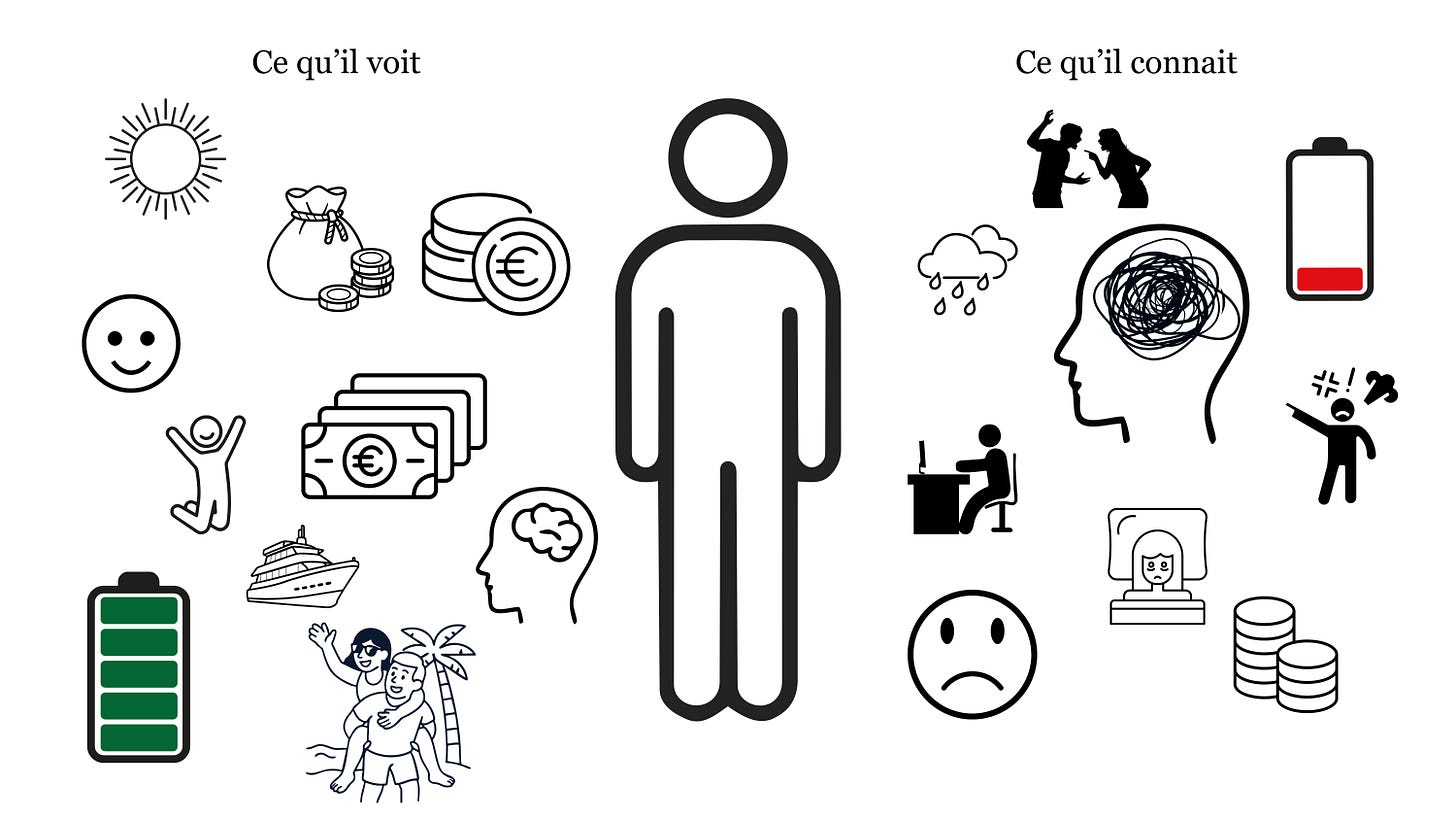 C’est une comparaison radicalement asymétrique. Il compare le meilleur scénario imaginaire d’un inconnu avec la réalité imparfaite qu’il vit lui-même. Ce n’est pas de la comparaison. C’est un jeu qu’il a perdu avant même de commencer.