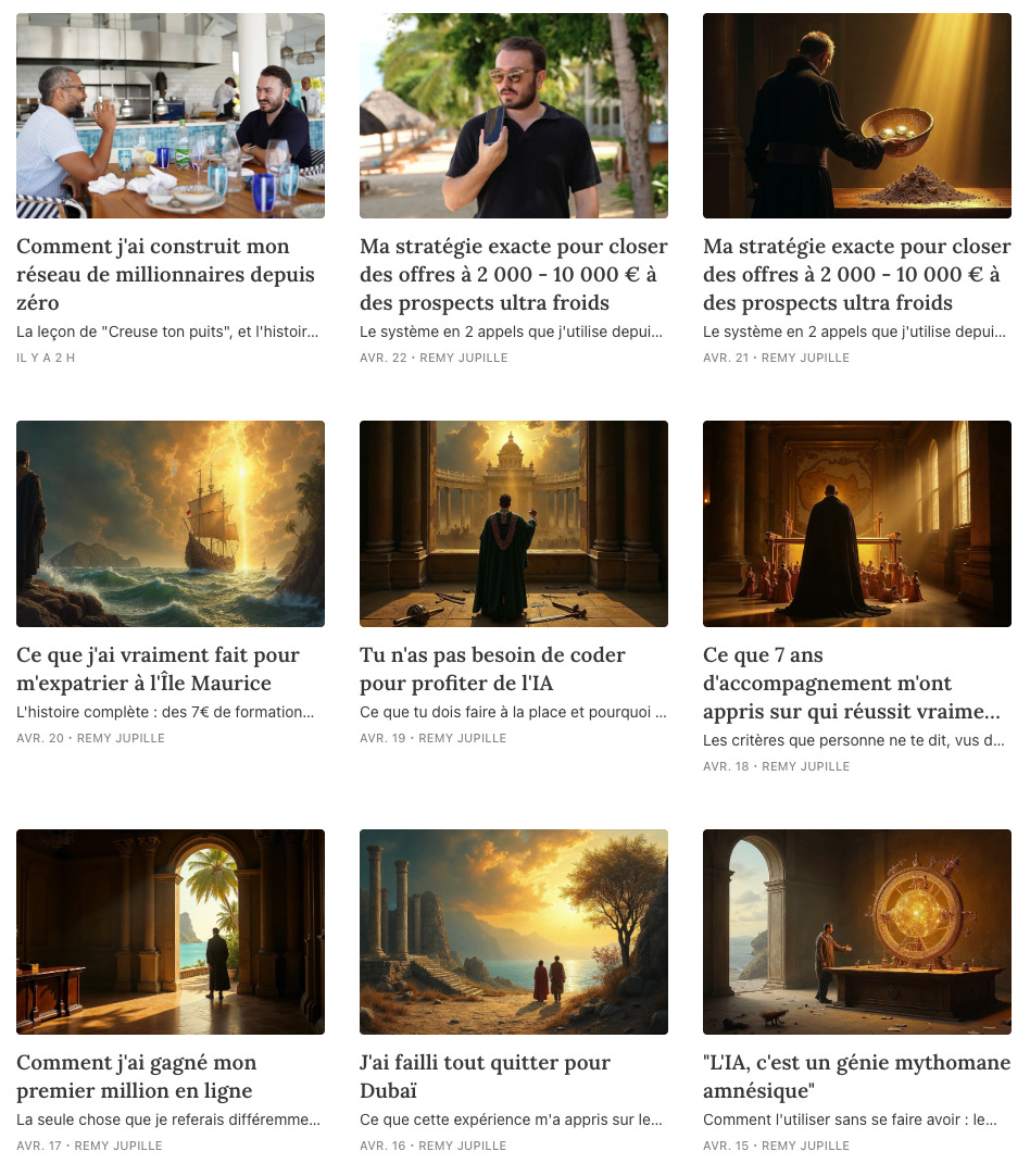 Je publie ces articles sur Substack, un réseau social hybride entre blog et plateforme sociale. Ce qui est génial avec Substack, c’est que chaque article vit à la fois sur votre blog (indexé par Google) et sur le réseau social interne (où les gens découvrent et s’abonnent).