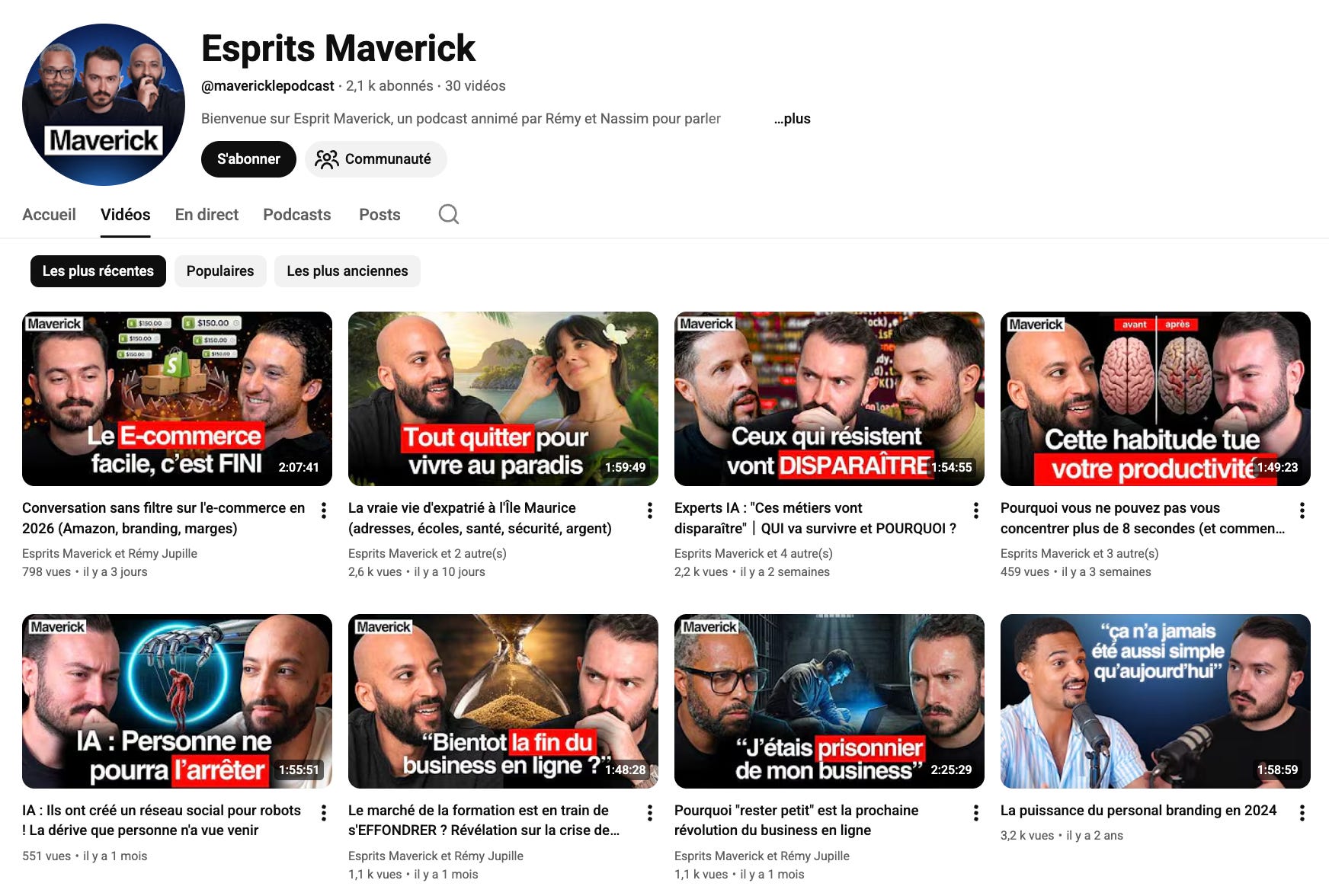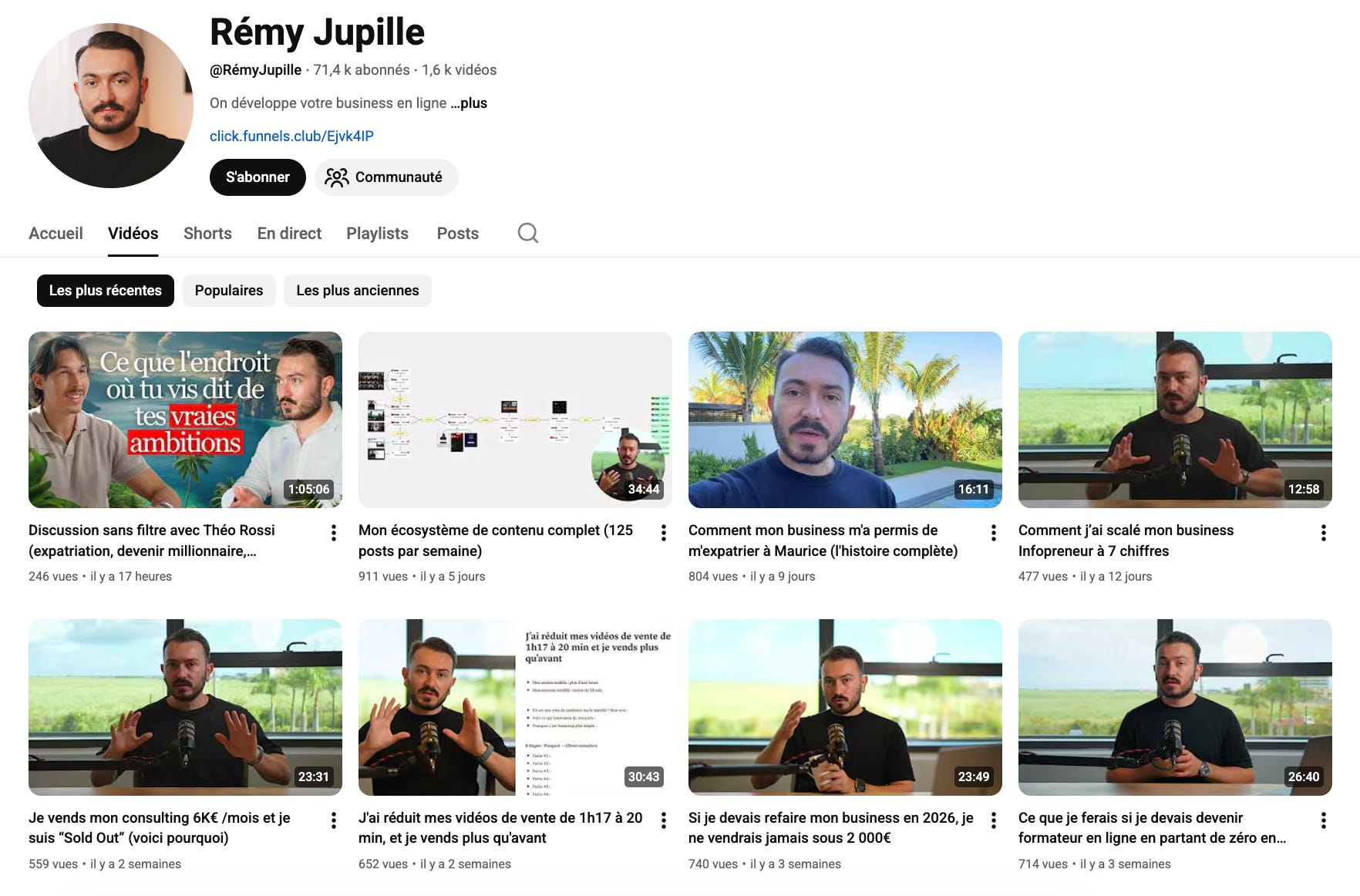 Ma chaîne principale : celle que j’ai depuis des années. Deux vidéos par semaine, ultra-nichées : des personnes qui veulent vendre des formations, du coaching, de l’accompagnement à plusieurs milliers d’euros. De plus en plus de créateurs arrêtent de parler de tout et de rien. Une chaîne = un sujet = une audience précise.