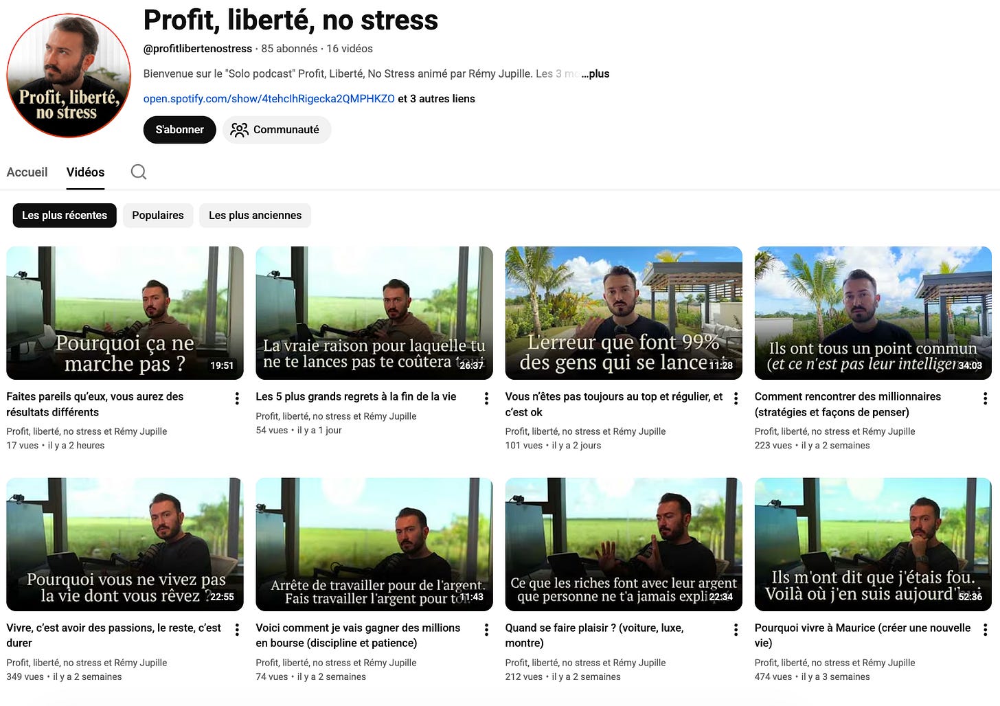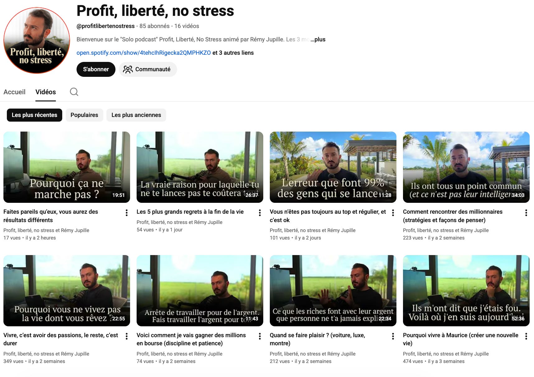 Ma chaîne secondaire (Profit Liberté No Stress) : mon podcast filmé. Je mets la caméra, j’appuie sur play, je fais mon épisode. Zéro montage. L’objectif : montrer que n’importe qui peut créer du contenu sur YouTube de manière simple. Et ça a pris très vite, certains épisodes dépassent les 600 vues sur YouTube alors que sur le format podcast audio, le même contenu en faisait moins.