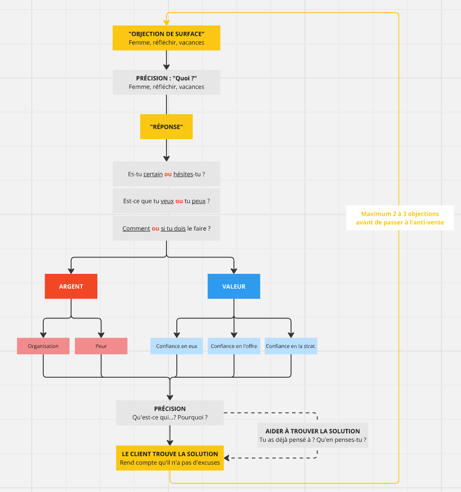 Si une objection vient, le processus est toujours le même. D’abord, préciser : “Quand tu dis que tu dois y réfléchir, à quoi exactement ?”